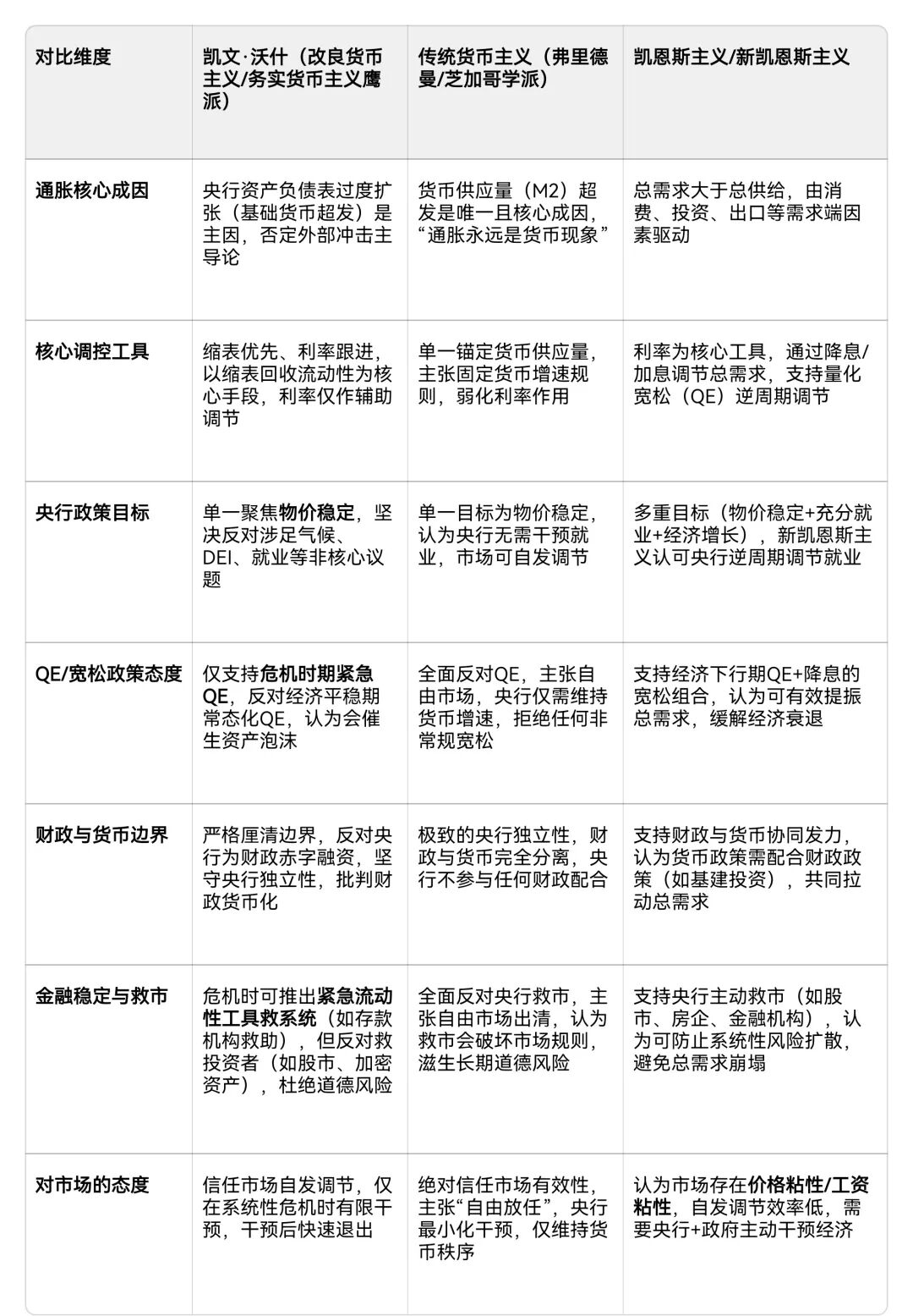 3. 强调央行独立性,反对财政货币化,拒绝为政府赤字融资,与货币主义“央行与财政部严格划界”的主张一致。