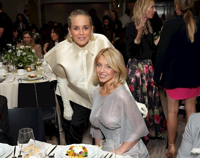 斯维尼近期最富争议的作品除了牛仔裤广告,还有出席《综艺》杂志“女性力量”颁奖礼时的扮相(身旁是莎朗·斯通):